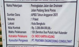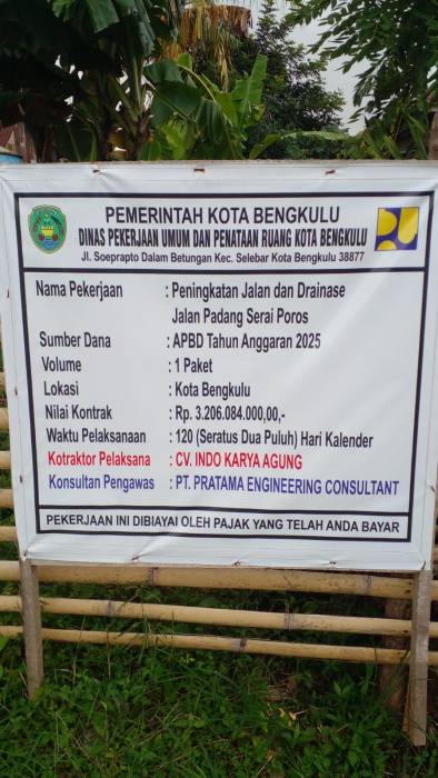 Menguras dana APBD Kota Bengkulu tahun anggaran 2025 cukup besar sangat pantastis Rp 3,2 miliar lebih, panjang trotoar hanya 1,2 km dan drainase panjangnya 600 m + siring pembuangan 200 m dikerjakan CV Indo Karya Agung dikerjakan asal jadi