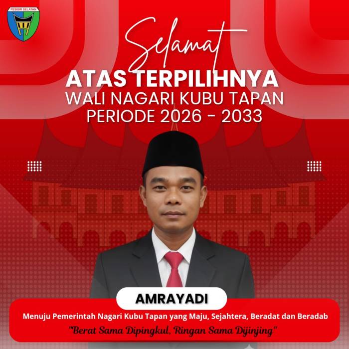 Menuju Pemerintah yang Maju, Sejahtera, Beradat, dan Beradab dengan Moto “Berat Sama Dipikul, Ringan Sama Dijinjing”Pesisir selatan, Sumatera Barat. METRO UPDATE.COM – Kamis, 18 Desember 2025. – Setelah proses pemilihan yang telah berlangsung sesuai dengan ketentuan yang berlaku, Amrayadi resmi terpilih sebagai Wali Nagari Kubu Tapan untuk periode jabatan 2026 hingga 2033. Dalam pidato sambutannya yang penuh semangat dan harapan, Amrayadi mengemukakan visi pembangunan nagari yang fokus pada kemajuan bersama, kesejahteraan masyarakat, pemeliharaan budaya adat, serta peningkatan kesadaran beradab di seluruh wilayah Nagari Kubu Tapan.