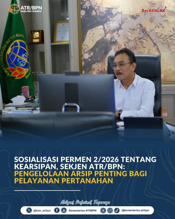 Sebagai informasi, sosialisasi terkait kearsipan akan dilakukan secara rutin hingga akhir Oktober 2026. Kegiatan kali ini diikuti secara daring oleh satuan kerja Kementerian ATR/BPN, baik di Kantor Wilayah BPN Provinsi maupun Kantor Pertanahan Kabupaten/Kota seluruh Indonesia. (AR/JM)